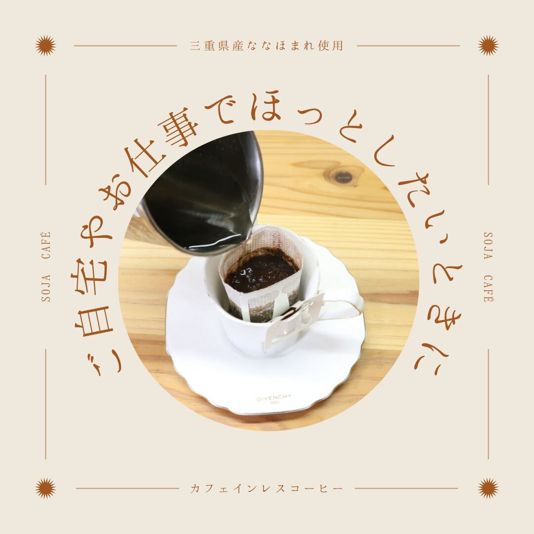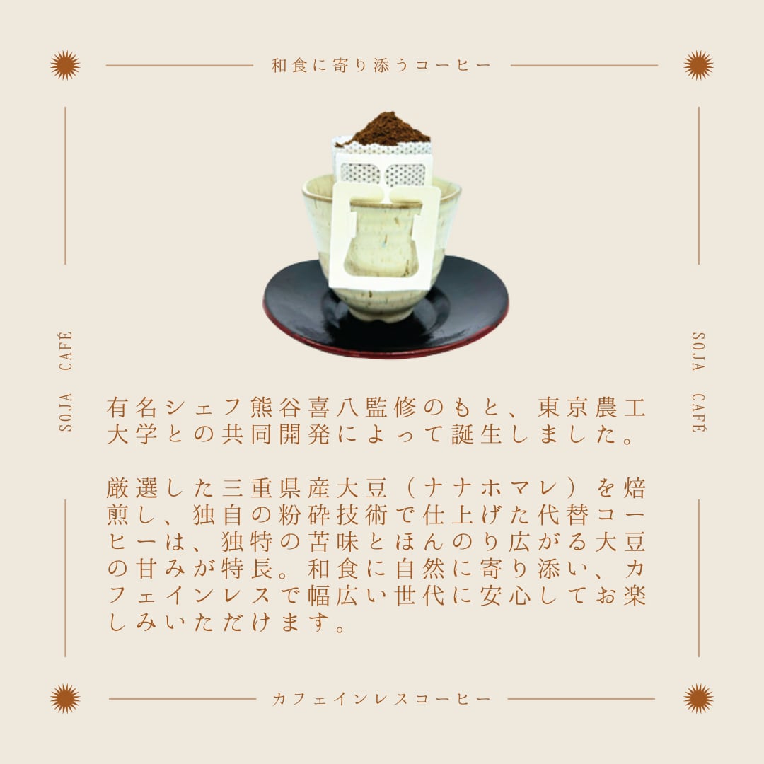 三重県東員町の農家さんと契約栽培した大豆「ななほまれ」を、自社で粉砕・焙煎しています。カフェインレスなので、就寝前にお召し上がりいただけるのはもちろん、小さいお子様からご高齢の方、妊娠中の方まで安心してお召し上がりいただけます。
